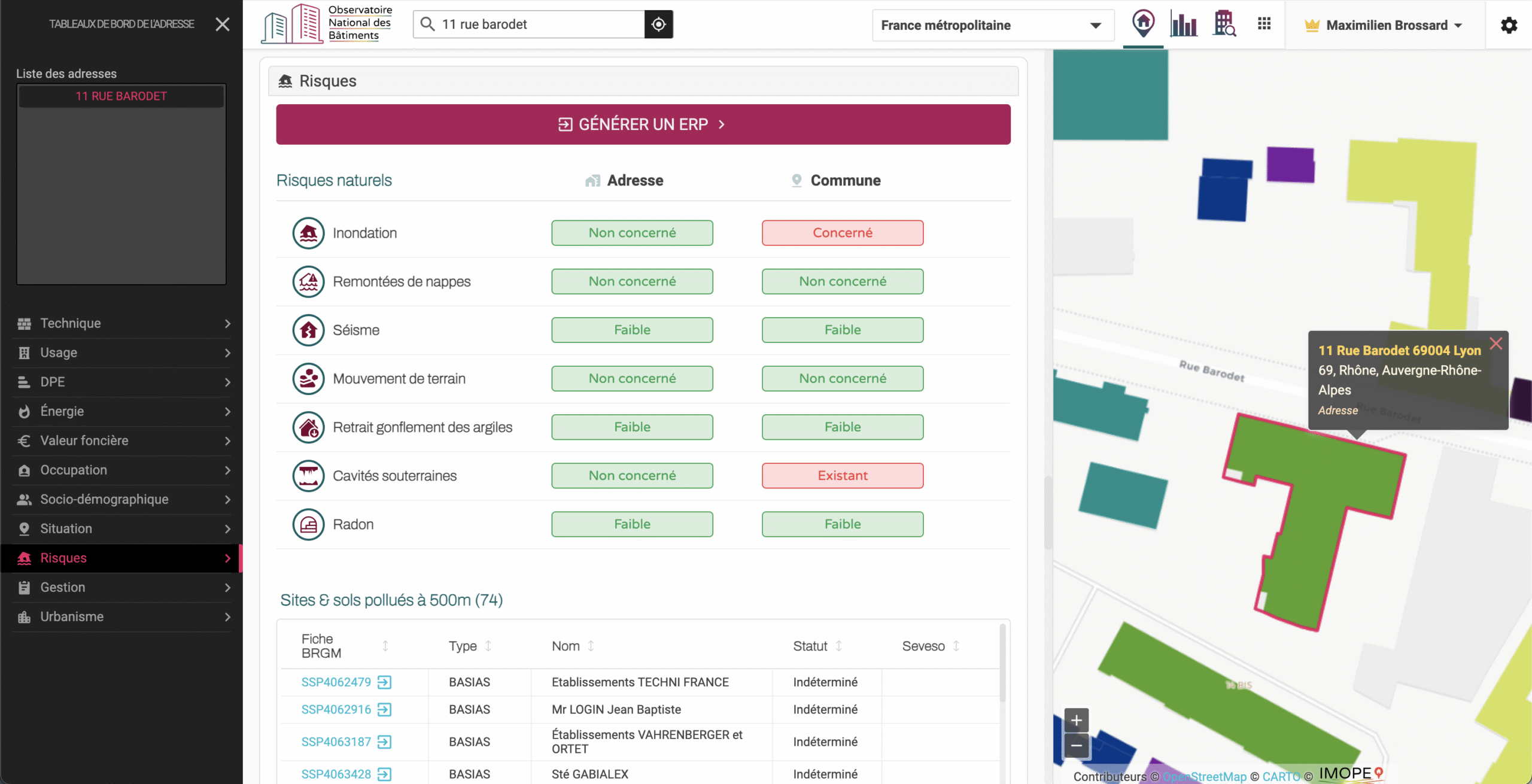 🟤 Sites et sols pollués | Intégration des bases BASOL et BASIAS, liste des sites à - 500m, lien direct vers fiche officielle | |