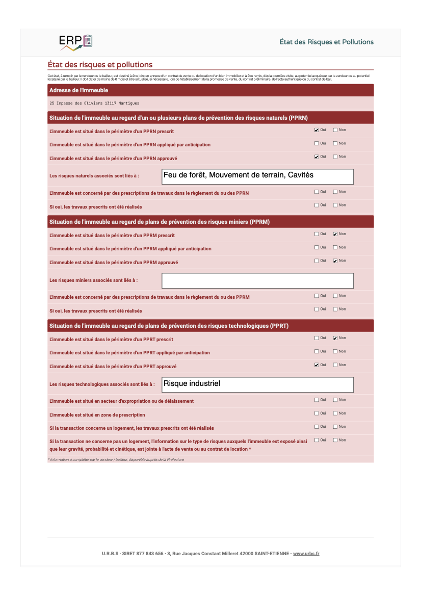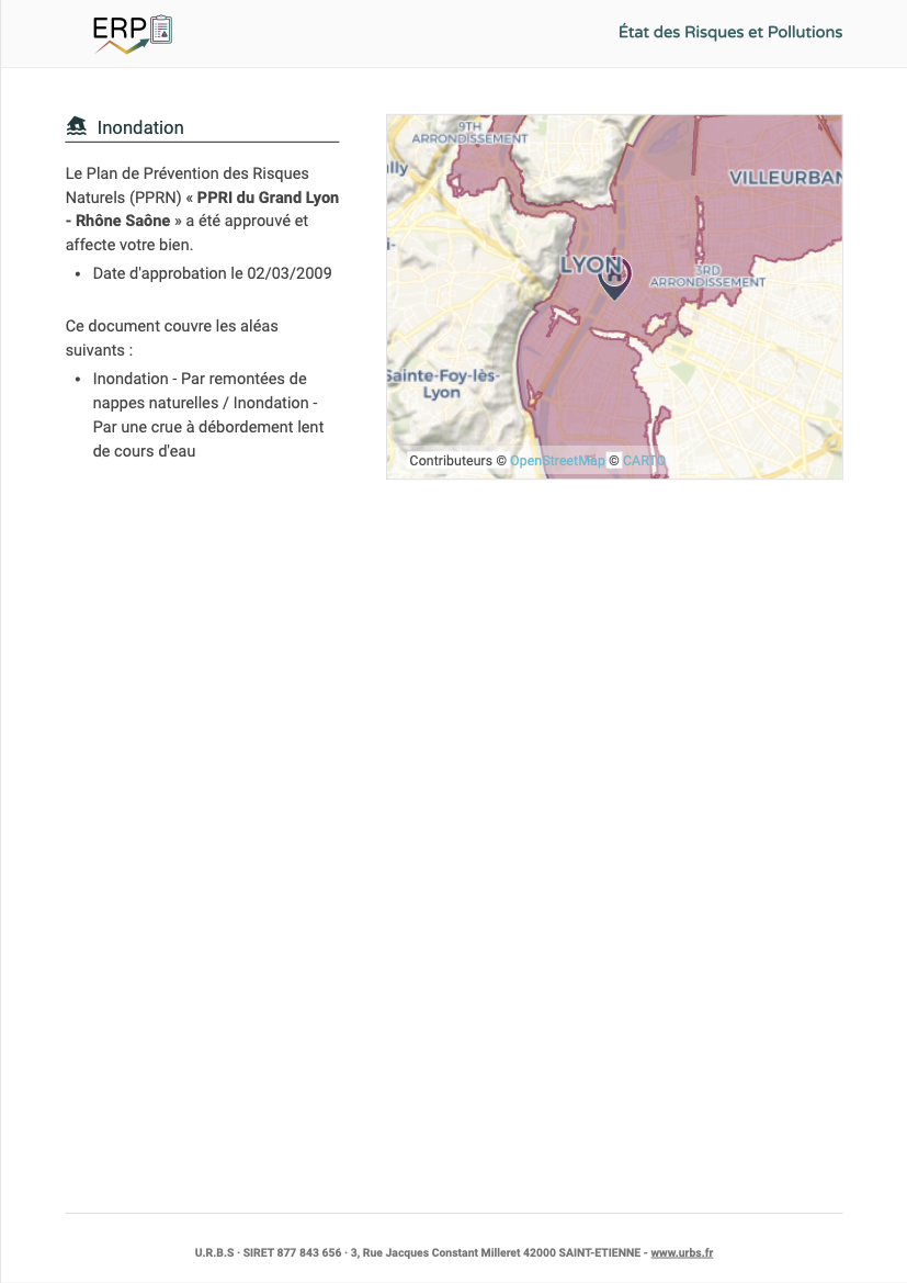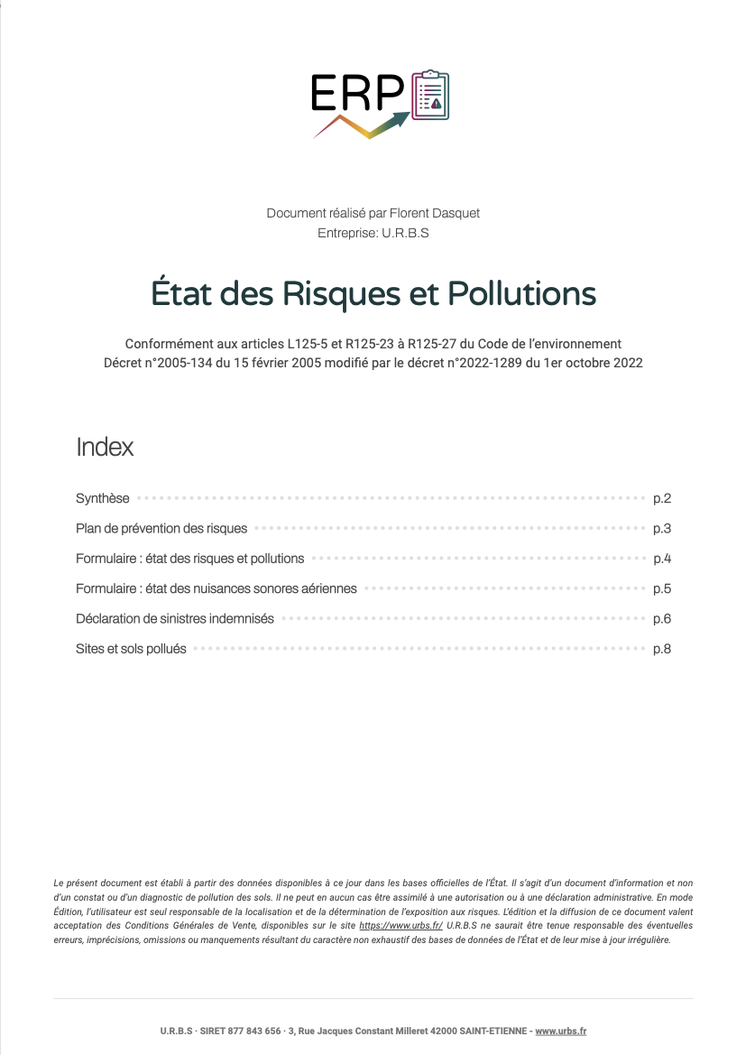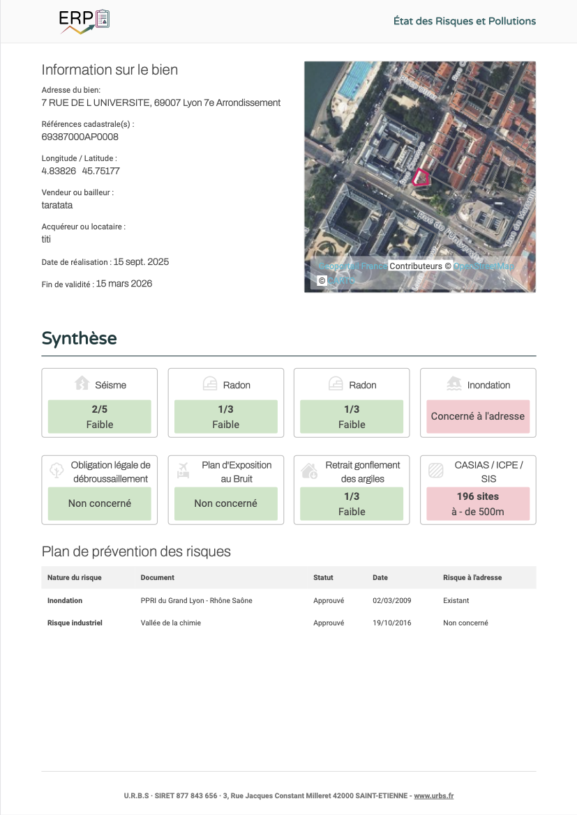 Nos États des Risques et Pollutions (ERP) combinent le contenu réglementaire obligatoire et des données enrichies pour une information complète sur chaque bien immobilier.